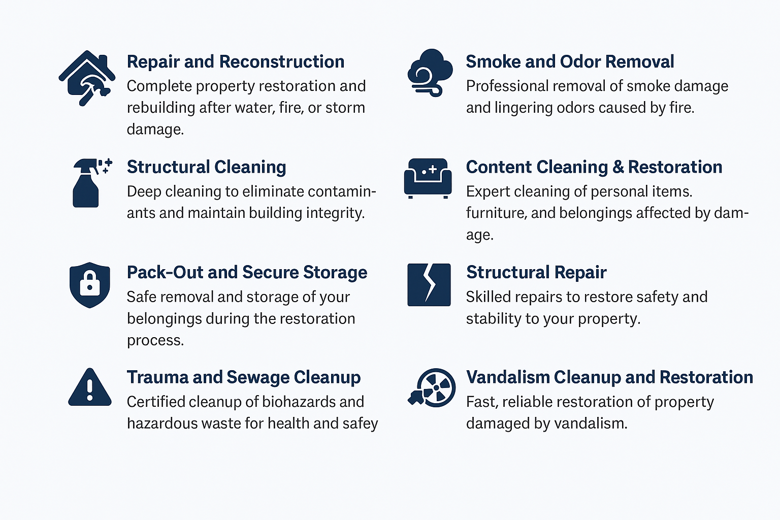 - Repair and reconstruction. Comprehensive restoration to rebuild and restore properties after damage.